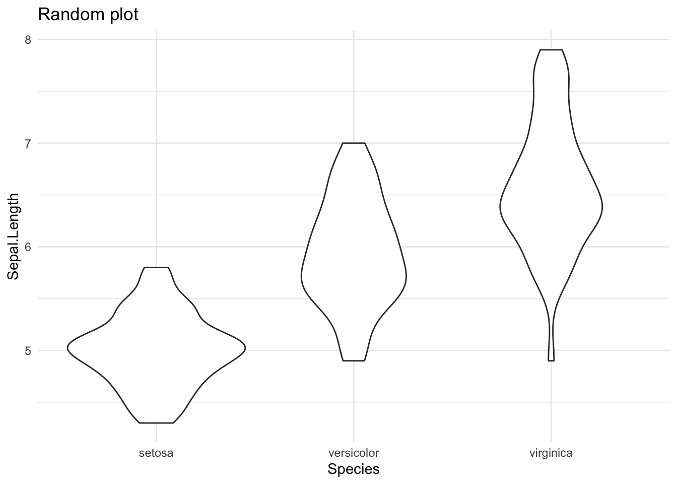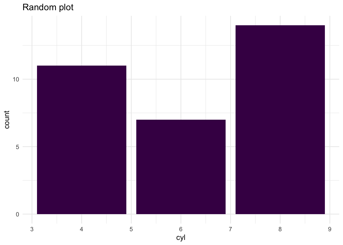 Of course, the idea is to combine this with a Shiny interface, for example random_ggplot() will be used with a renderPlot() and plotOutput(). And as we want to prototype but still be close to what your final application will look like, these functions take arguments that can shape the output: for example, random_ggplot() has a type parameter that can help you select a specific geom.